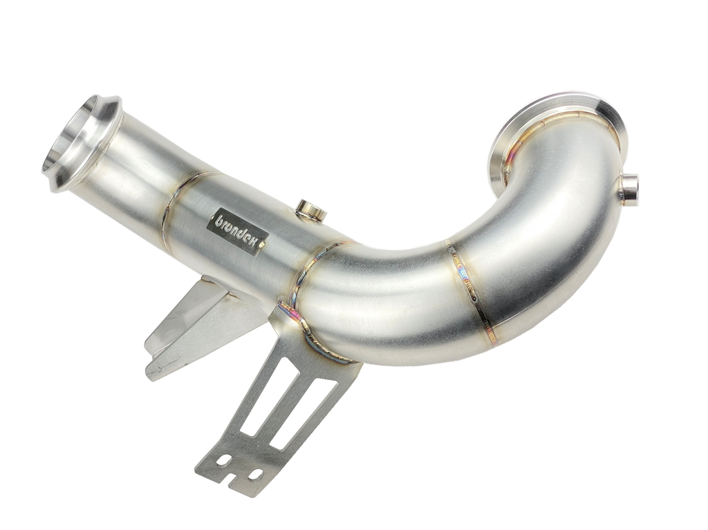Le downpipe Mercedes CLA45 S AMG C118 / X118 4-Matic+ 2.0L Turbo est disponible avec deux options principales : le downpipe catless CLA45 et le downpipe avec catalyseur sport à flux élevé 200 CPSI (catted downpipe).