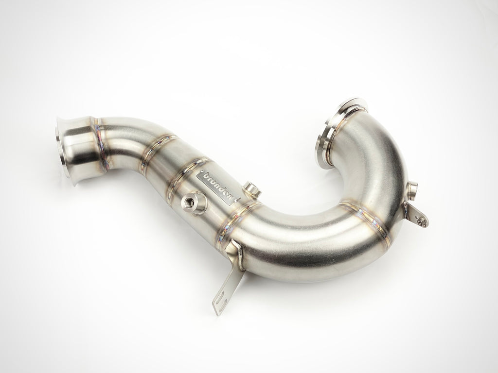 Downpipe for Mercedes GT53 X290 AMG 4 door coupe (3.0 Turbo M256 engine). The two main options available are GT53 catless downpipe and catted downpipe (downpipe with 200-cell High Flow Sports Catalytic Converter). Designed for both the racetrack and everyday driving, the BRONDEX® downpipe for the GT53 X290 maintains compatibility with OEM mounting points and sensors. This allows for straightforward installation and integration with the stock or aftermarket exhaust system. For those seeking further gains, the downpipe serves as a foundational upgrade in a broader performance build.